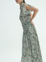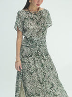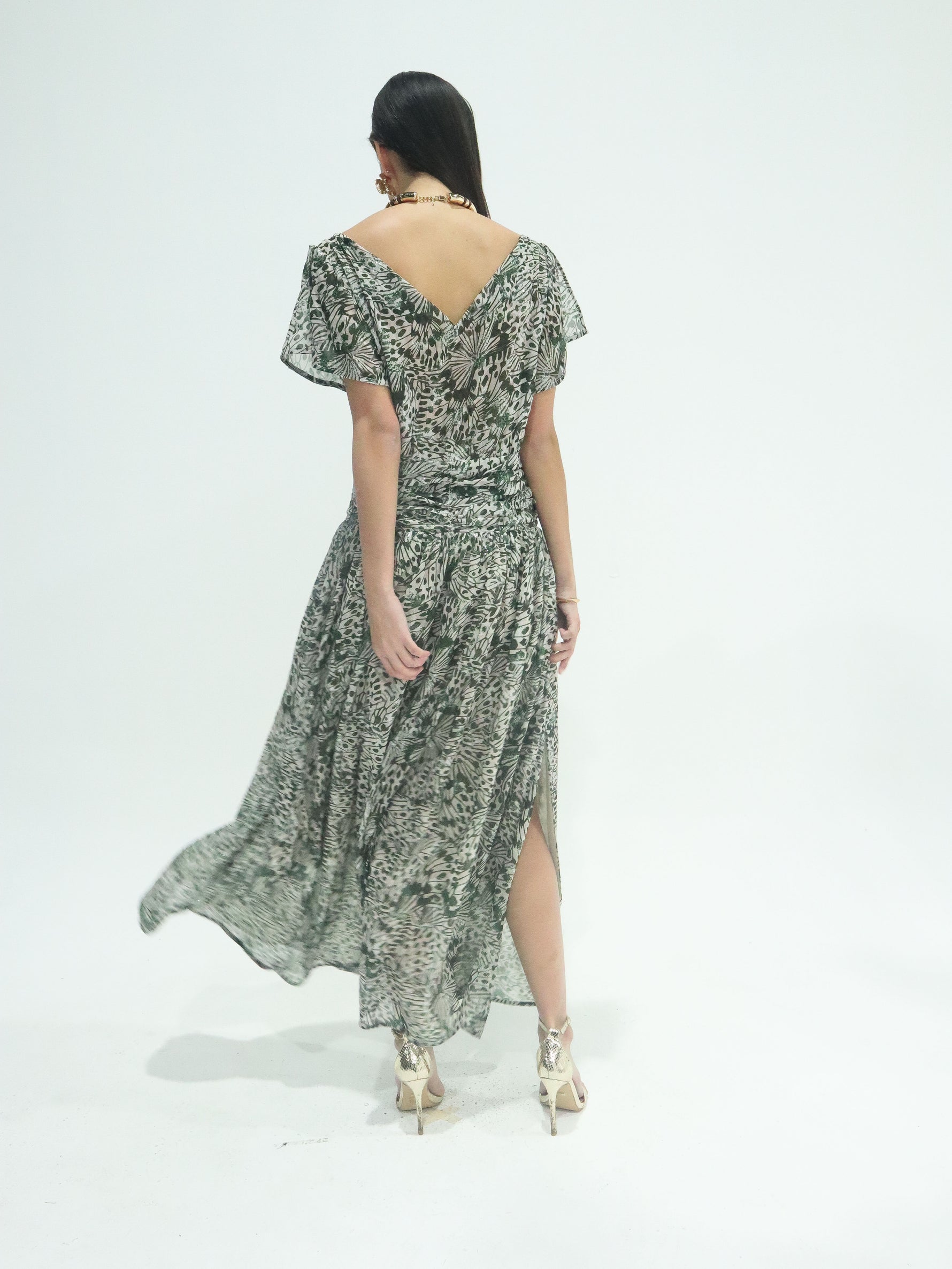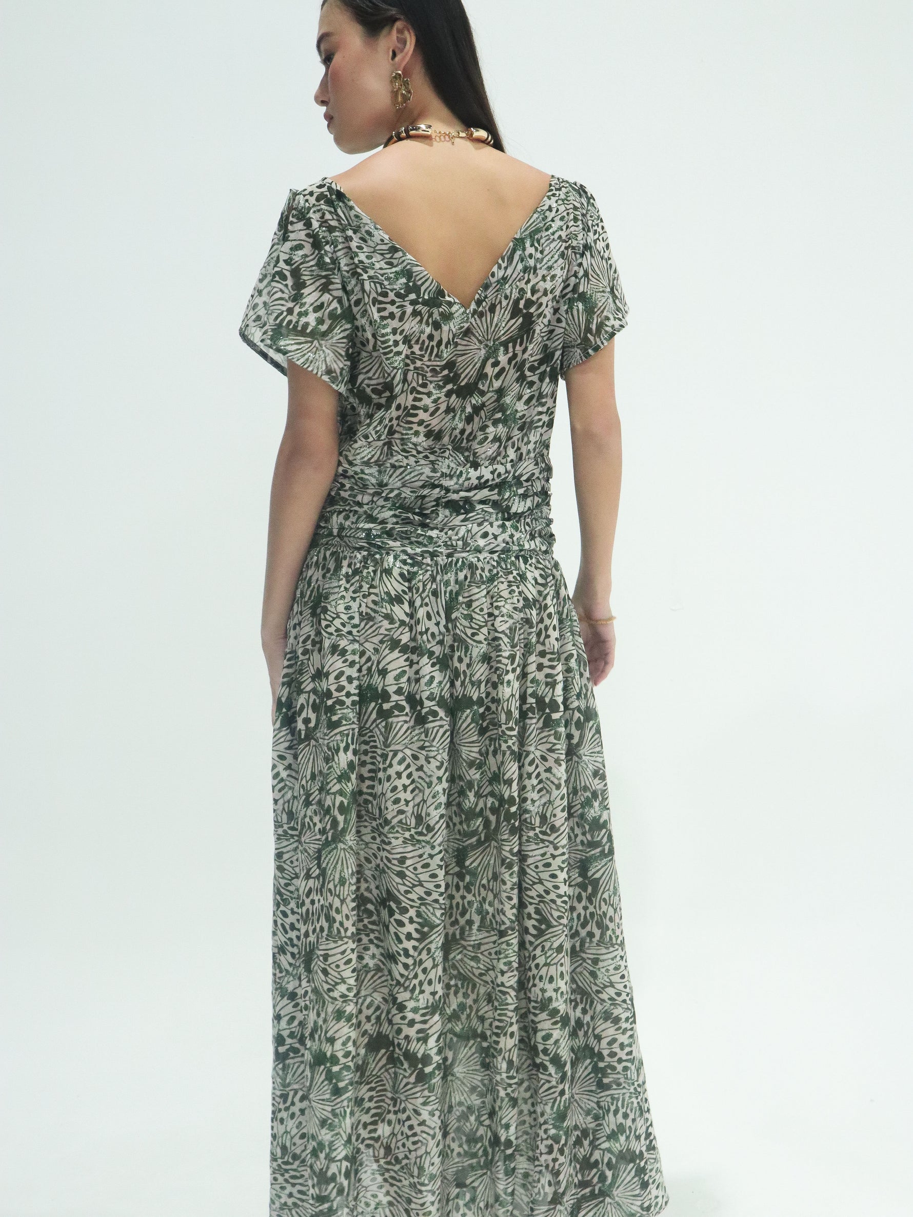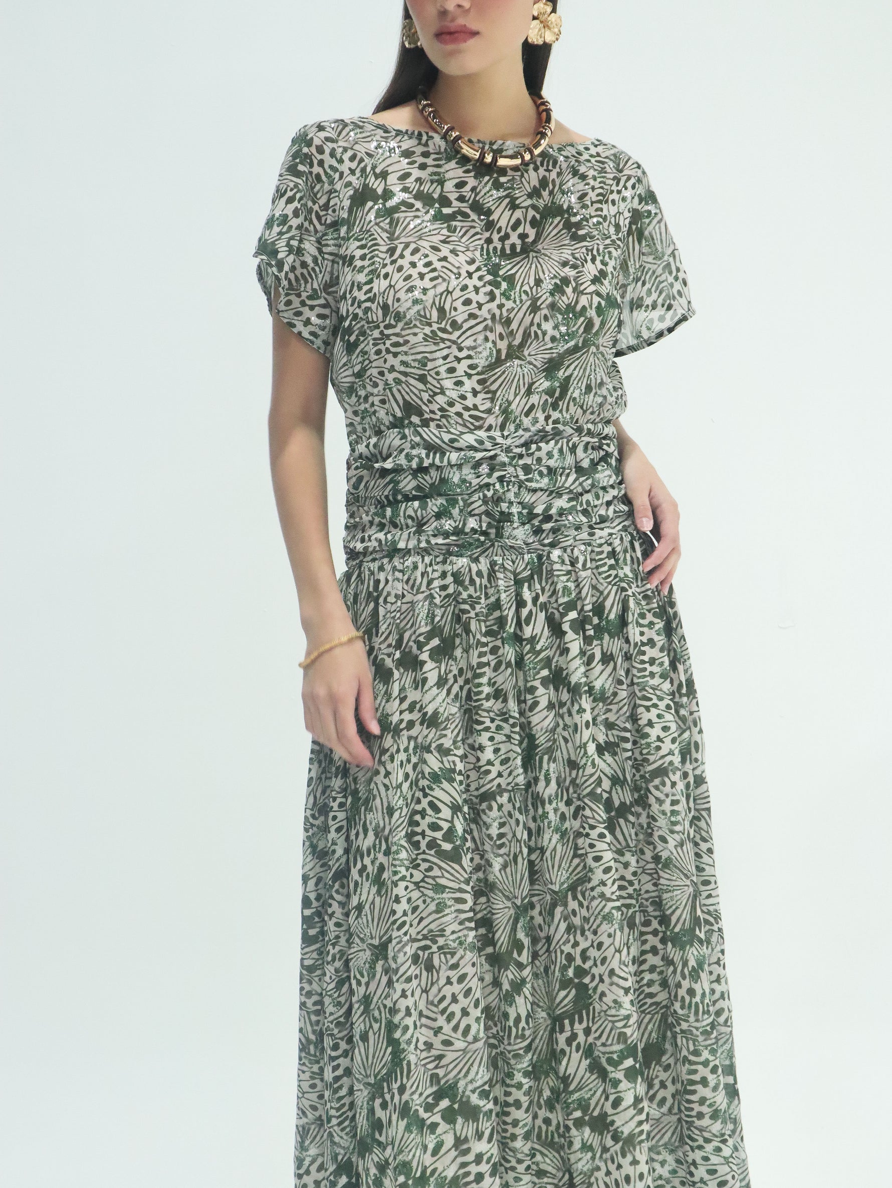 The Isabelle Beaded Polysilk Gown showcases a rich green polysilk base embellished with abstract floral beadwork for subtle dimension and shine. Designed with soft petal sleeves and a graceful boat neckline, it features a ruched waist that flatters the figure and a refined V-back for an elegant finish. Sophisticated and feminine, this gown brings polished charm to any special occasion.
