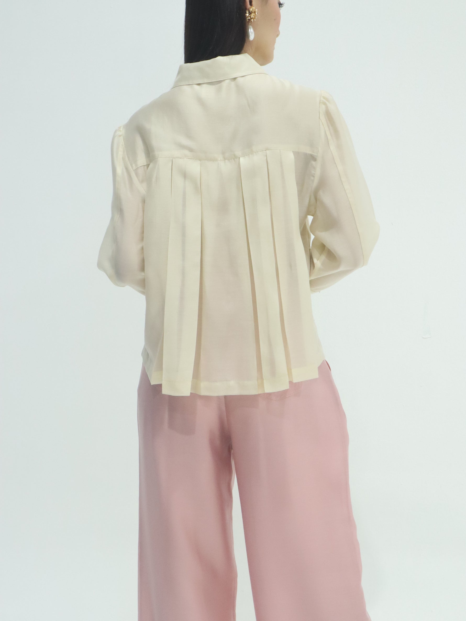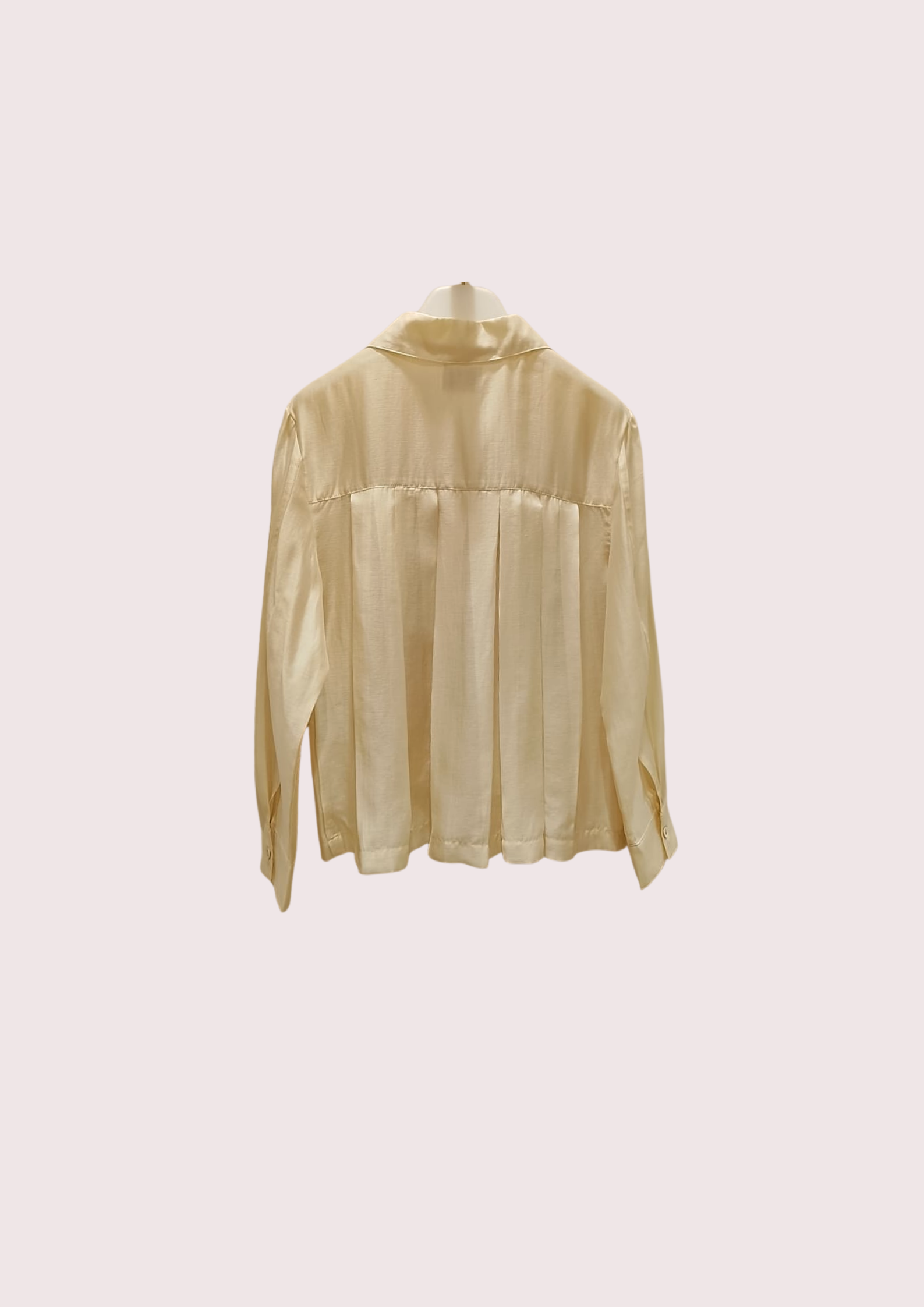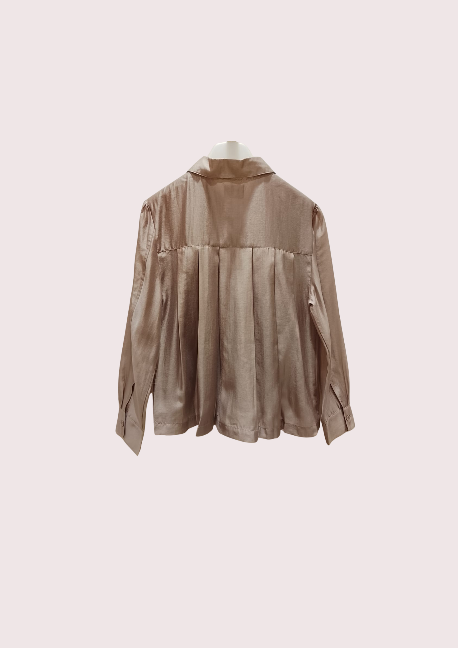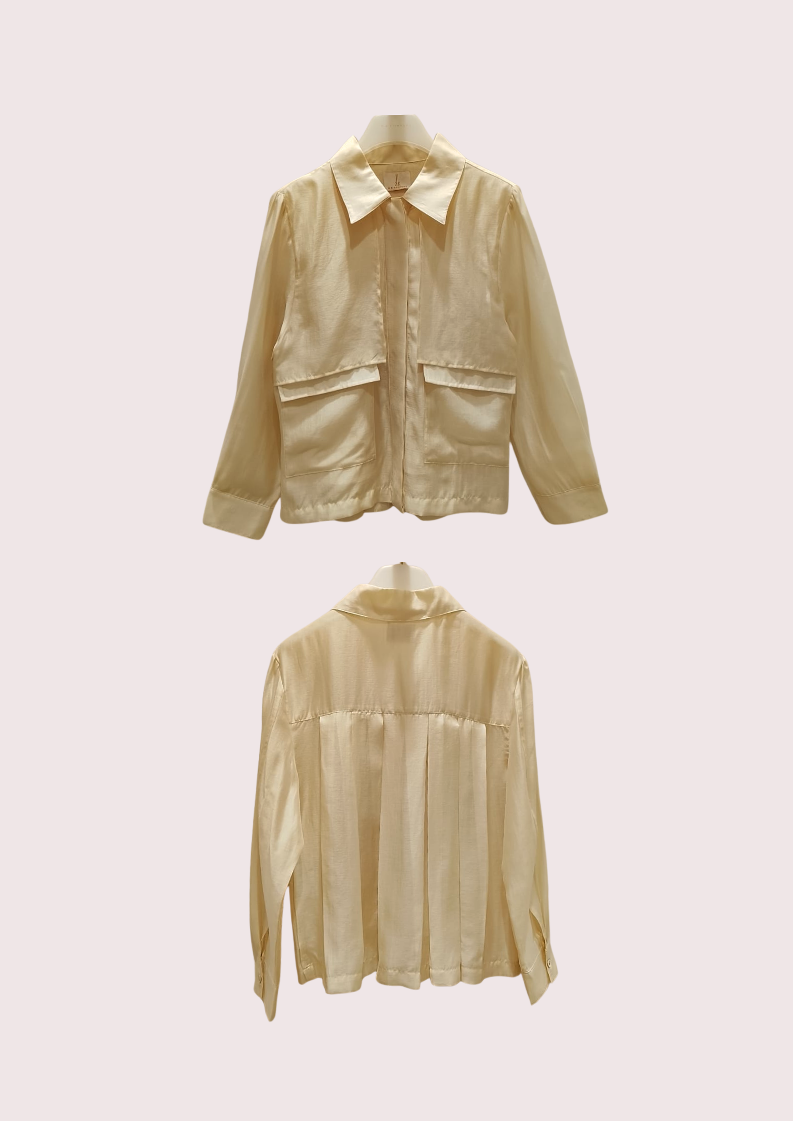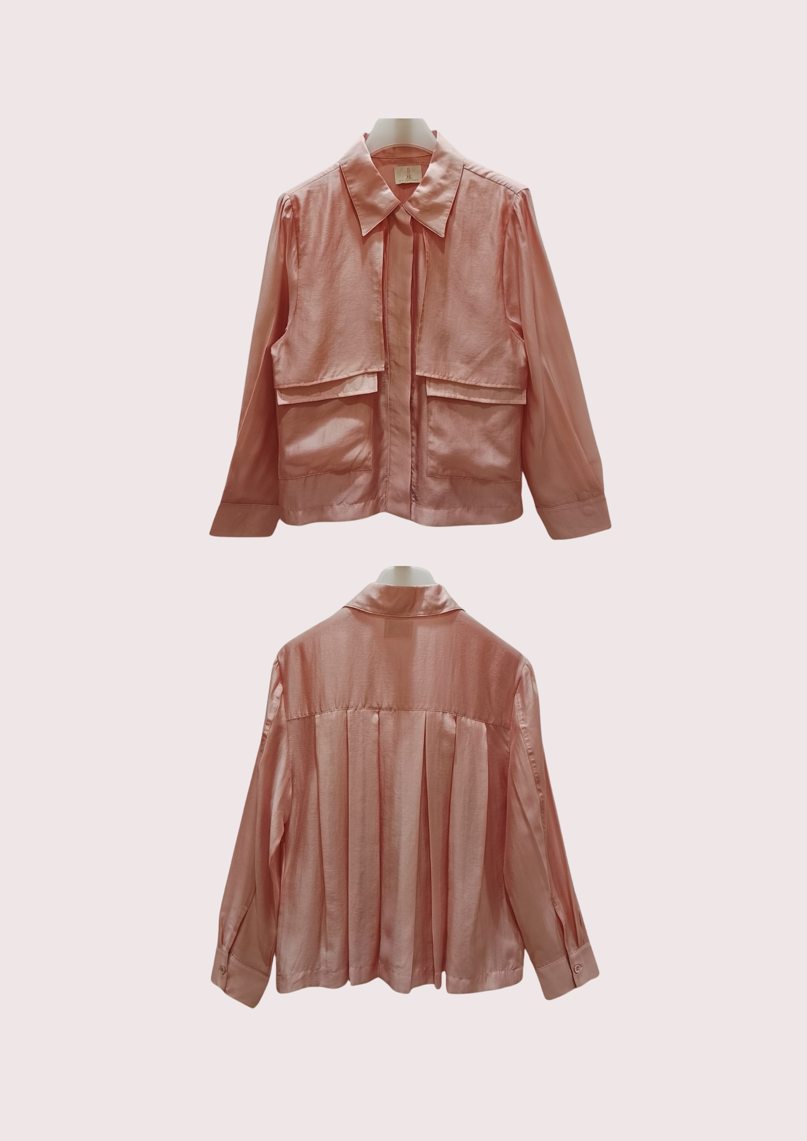 Unit price perThe Rafa Polysilk Blouse features a sophisticated collared neckline and a button-down front crafted from a smooth, lightweight polysilk fabric. This elegant, standard-length blouse is elevated by structural front utility pockets and a dramatic pleated back panel that adds fluid movement to its polished silhouette.