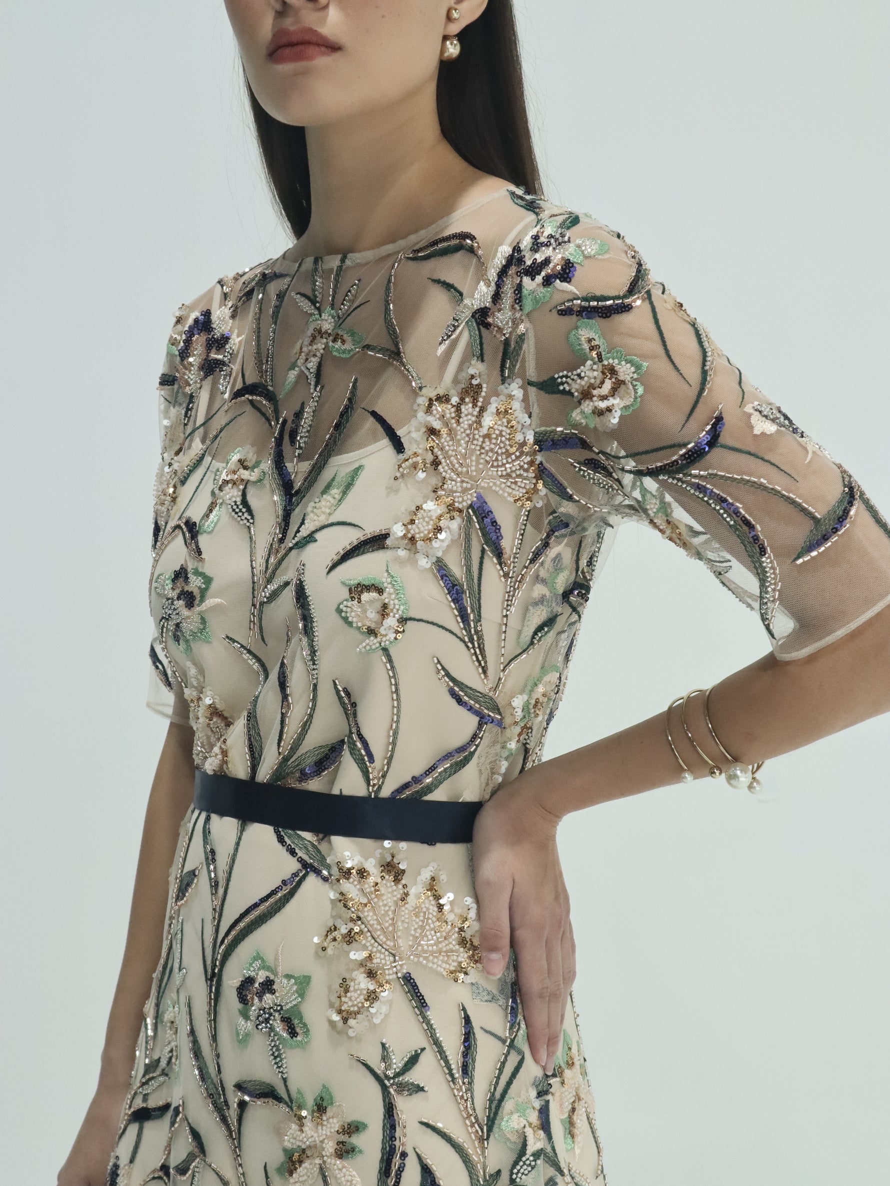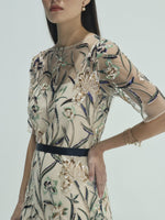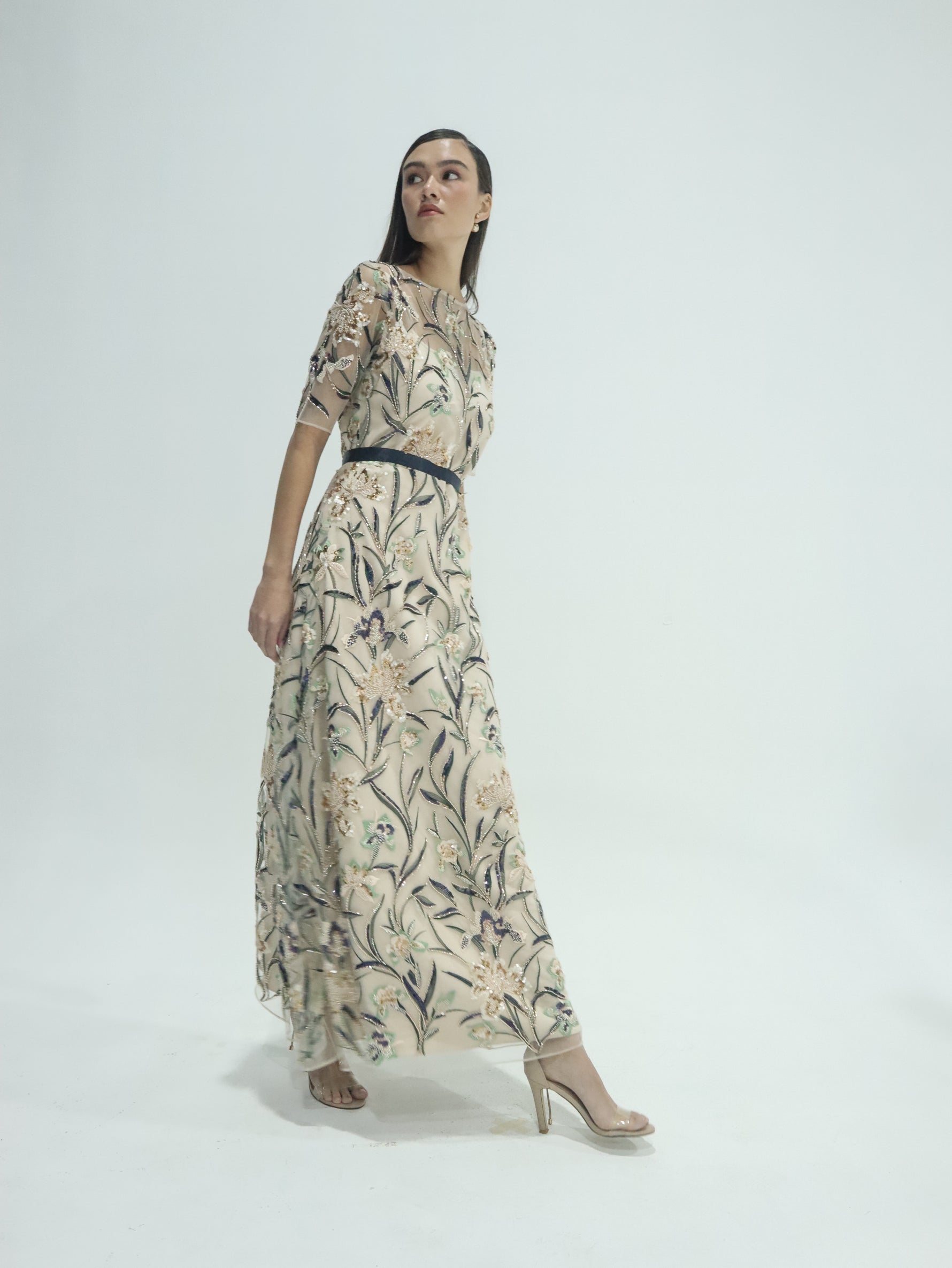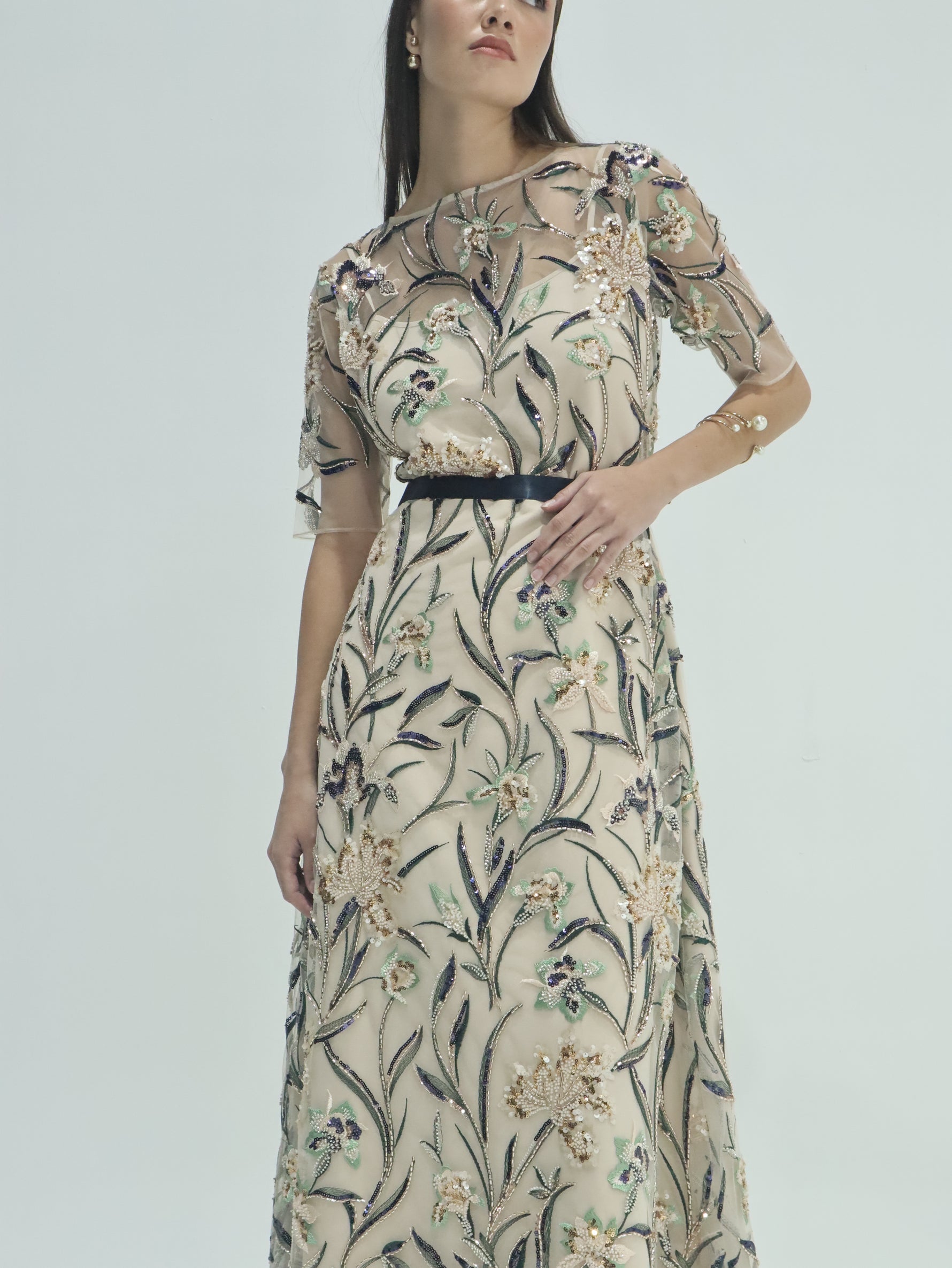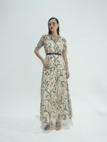 Unit price perThe Selene Sequined Tulle Dress is an elegant study in softness and detail. It is a breathtaking floor-length gown that showcases intricate artistry through its sheer tulle overlay. It features an elegant round neckline and short, translucent sleeves, all meticulously adorned with shimmering sequins and multi-colored floral embroidery. A contrasting dark sash cinches the waist to define the silhouette, while the flowing skirt creates a graceful, ethereal movement.