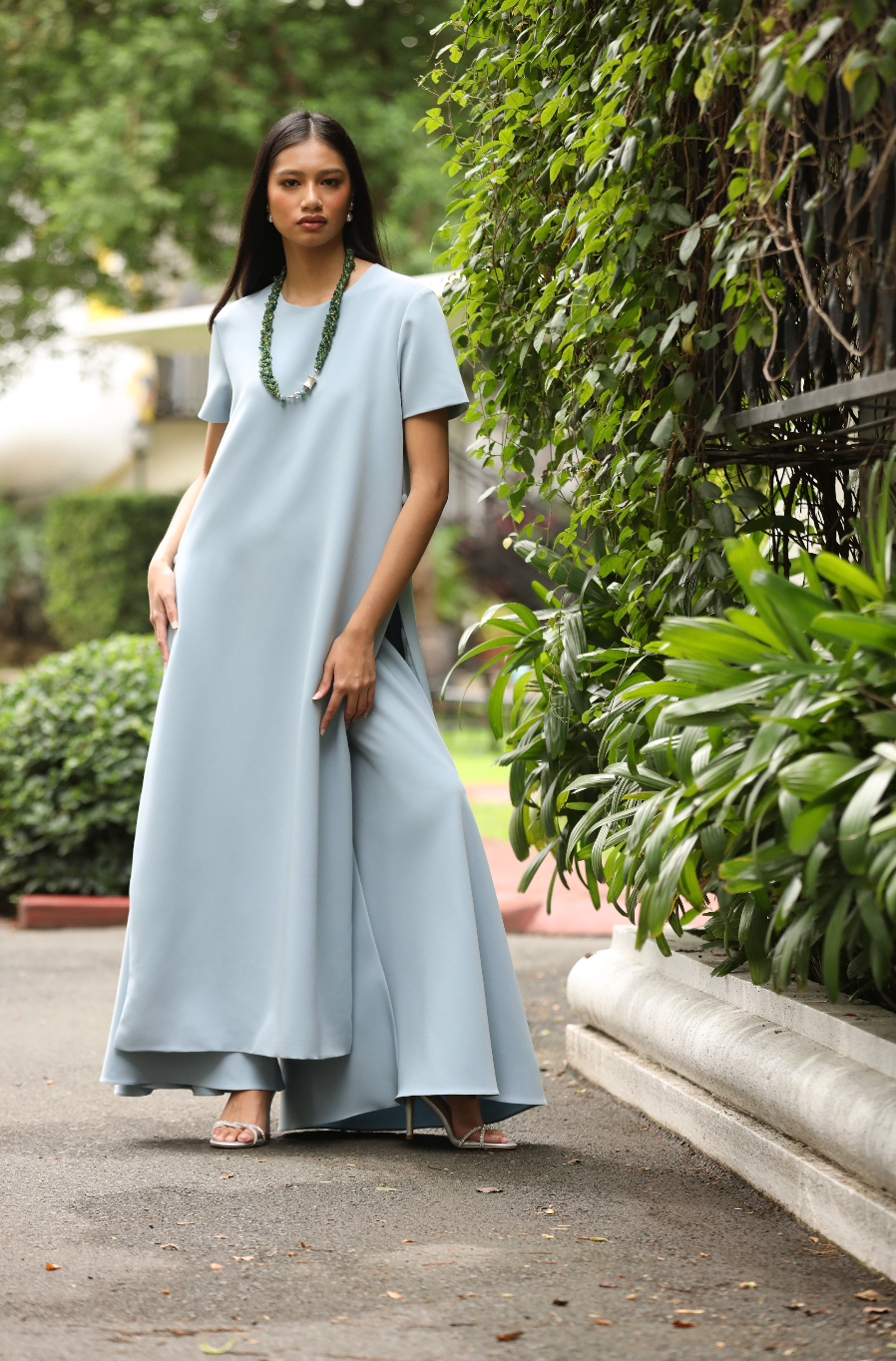 features an H-line dress with a side button closure that extends to the waist, transitioning into an open slit that reveals pants for a modern, chic look