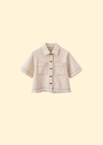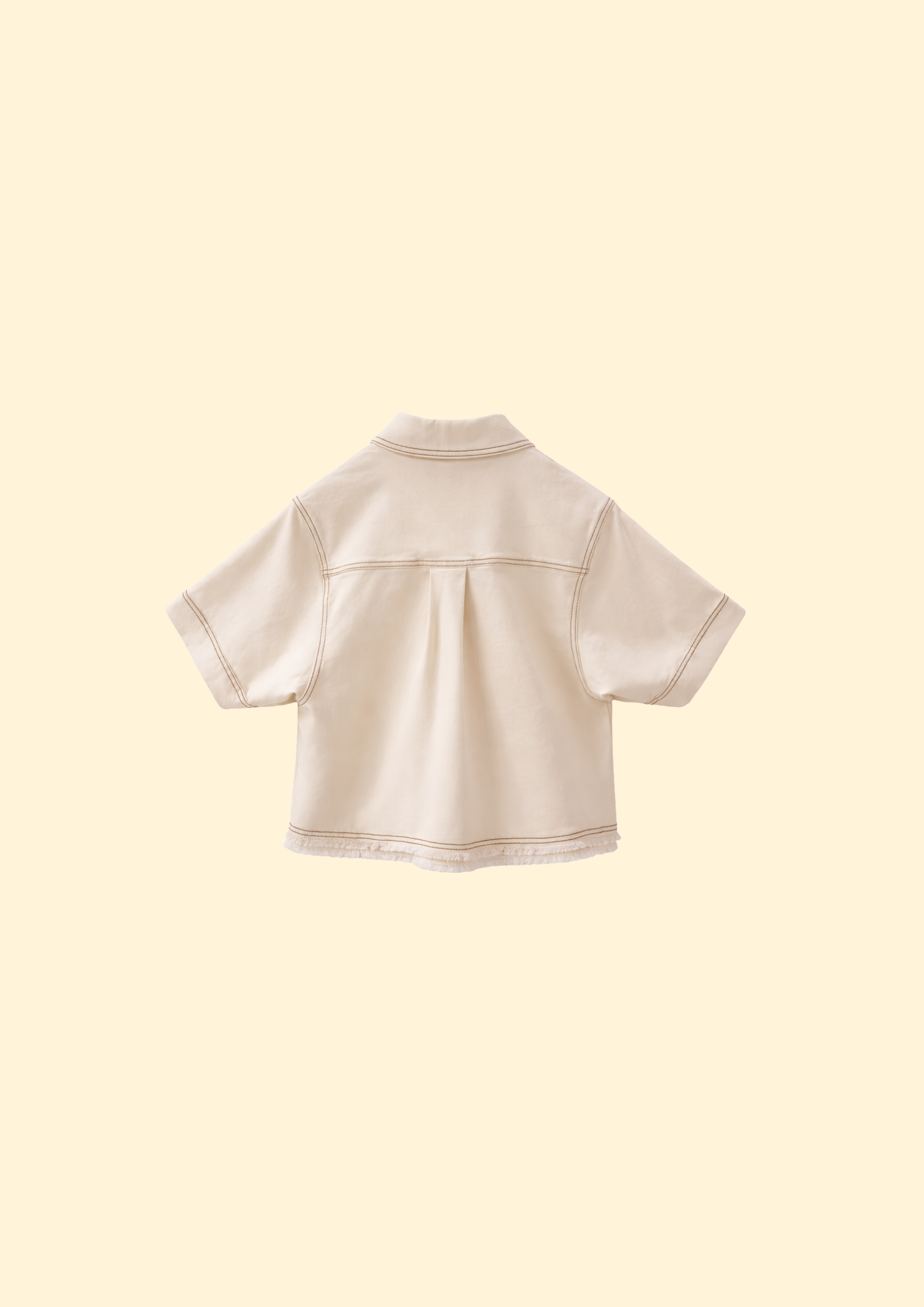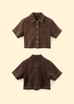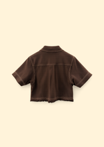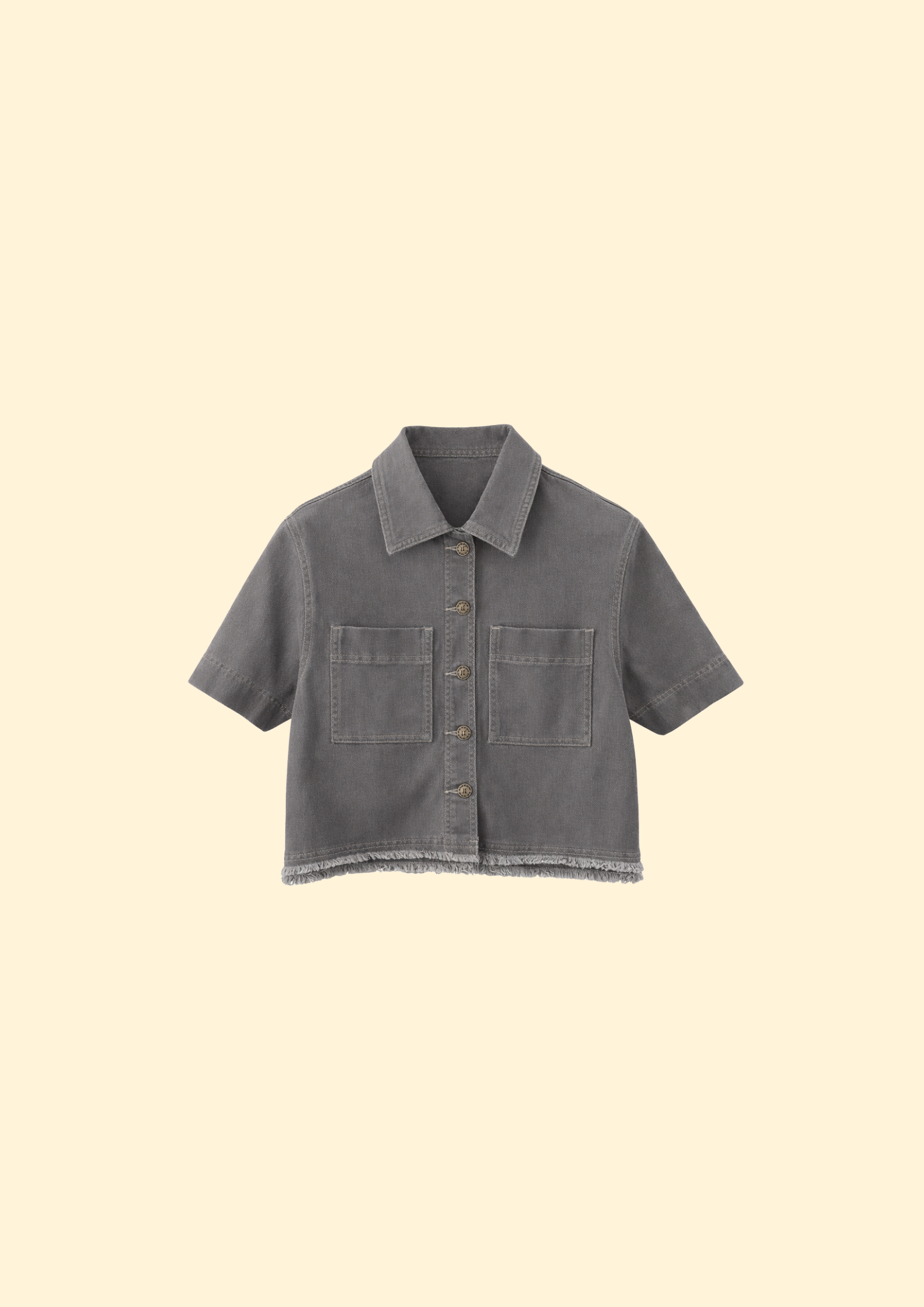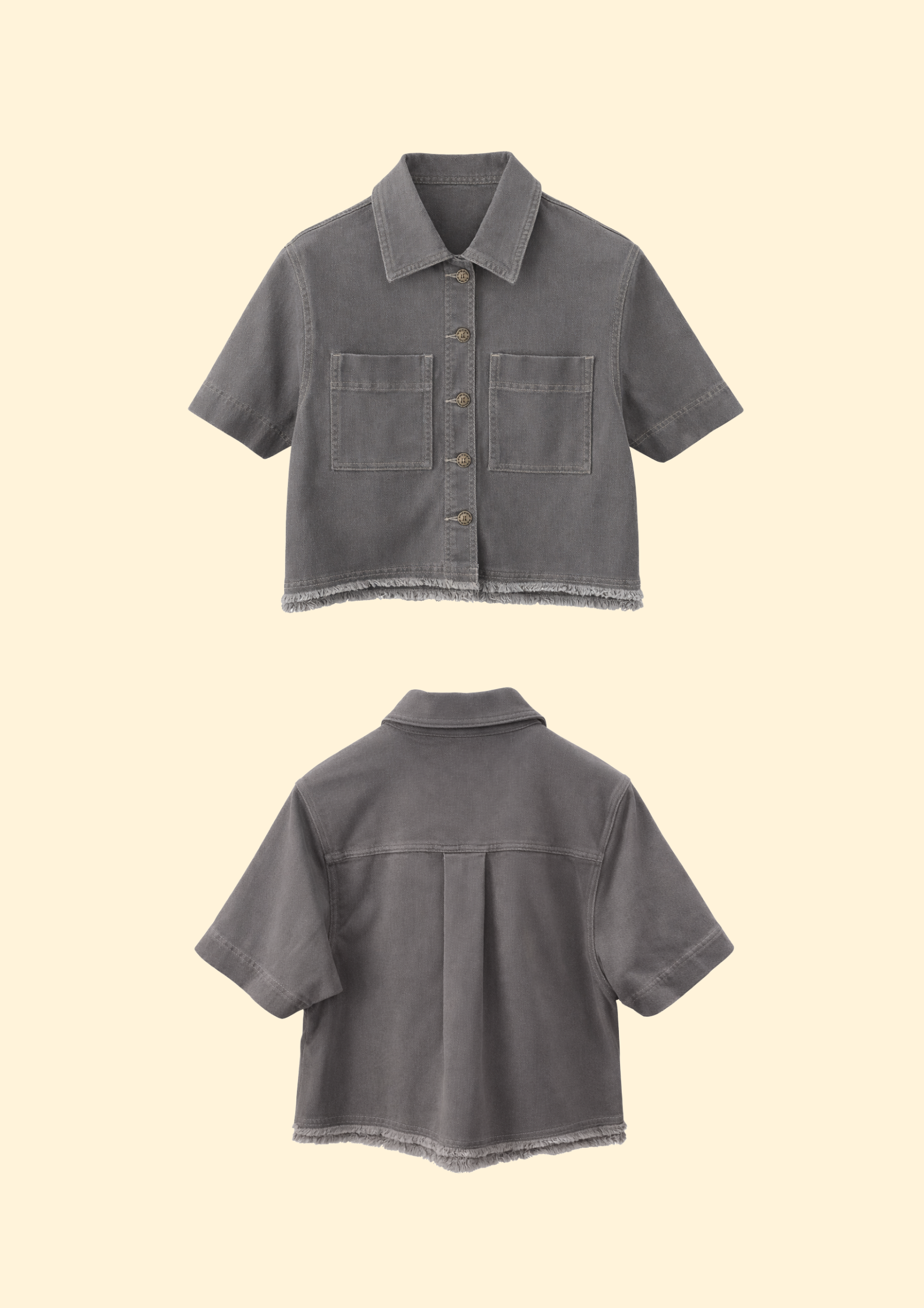 The Fiera Denim Top is a modern, utility-inspired cropped button-down top designed with a structured boxy silhouette. It features a classic pointed collar, short sleeves with refined top stitching details, and functional dual chest pockets. The design is further elevated by a unique frayed hem for a touch of edge and a back yoke with a central box pleat that adds comfortable volume. This versatile piece is an ideal choice for elevated casual outings, creative work environments, or weekend city strolls when paired with high-waisted trousers.