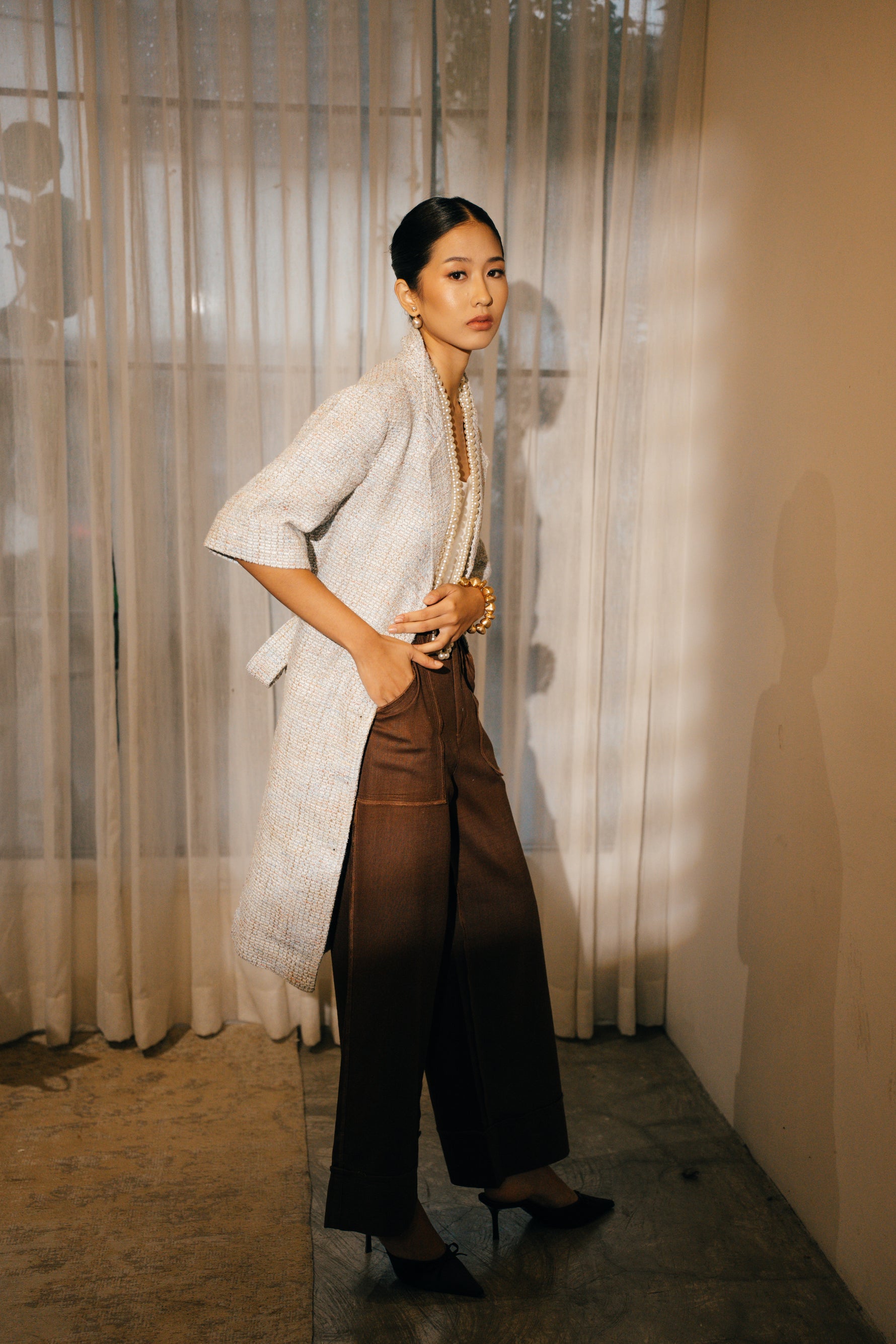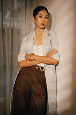 Unit price perThe Herschel Tweed Coat is crafted from textured tweed in a structured, mid-length silhouette. It features a sharp collared neckline, mid-length sleeves, and a clean front button closure. A self-fabric tweed sash allows for adjustable waist definition, while two discreet side pockets add everyday functionality. Fully lined for ease and comfort, the coat offers a refined drape and tailored finish. Ideal for layering, it adds warmth and texture without bulk—perfect for transitional weather and timeless styling.