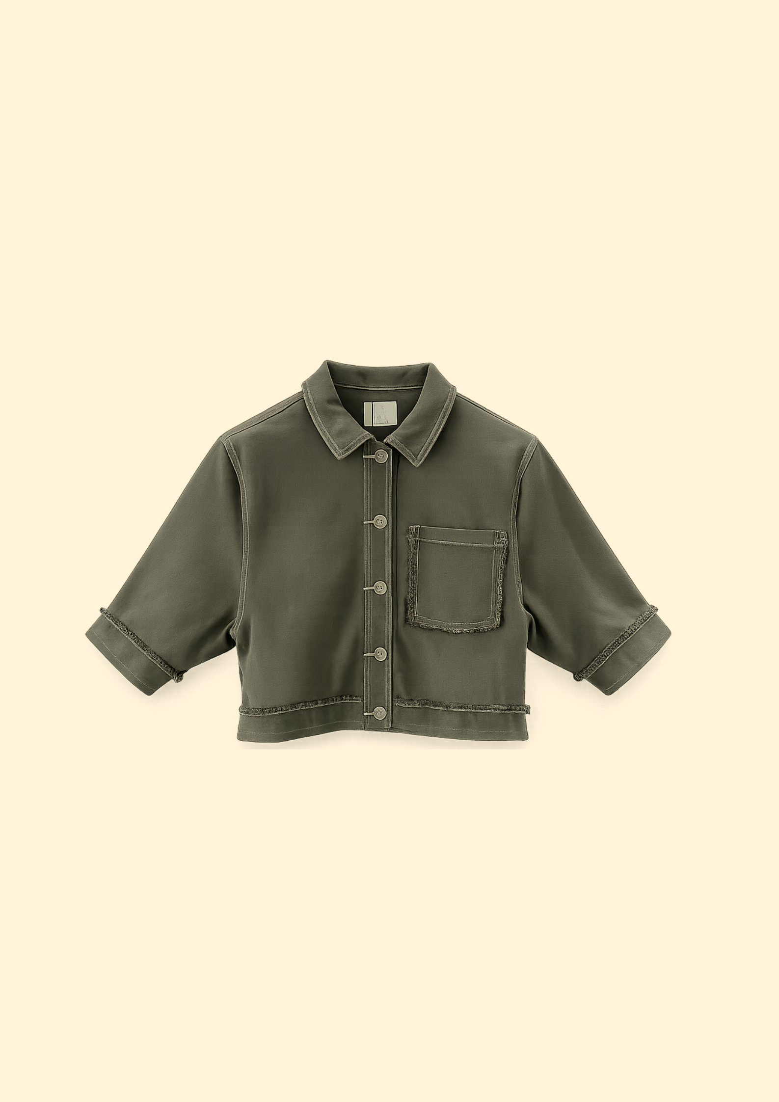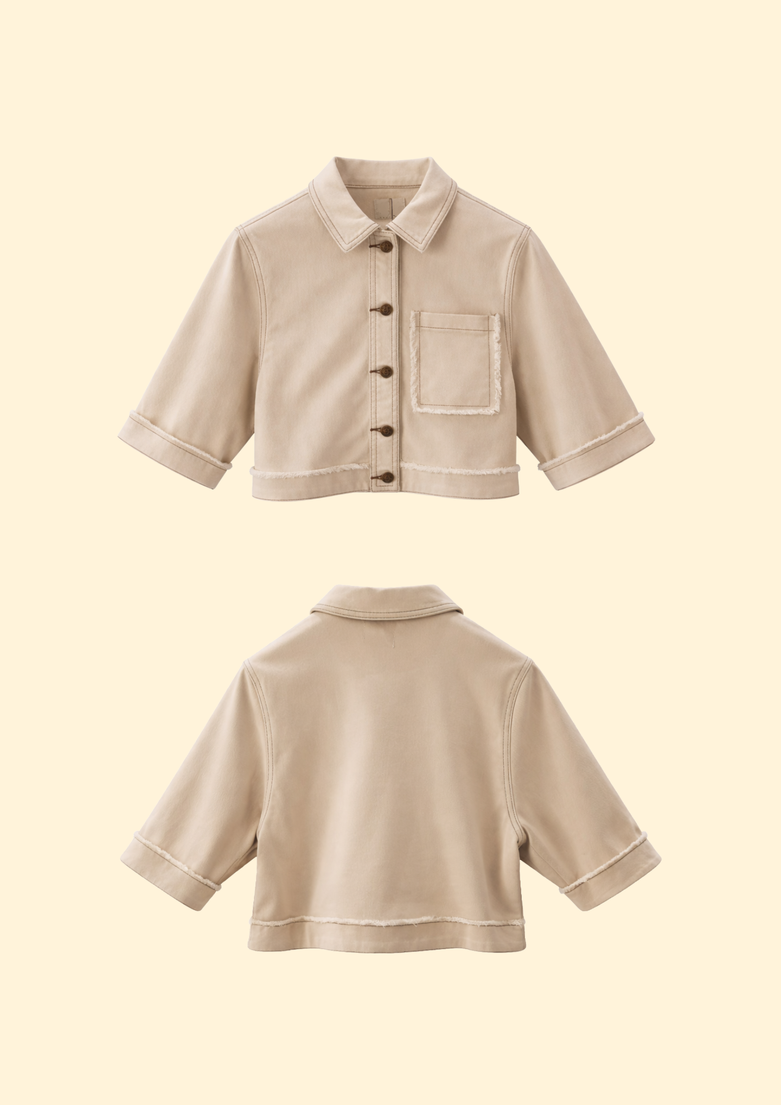 Unit price perThe Freslin Denim Top is a sophisticated cropped button-down blouse that balances a structured boxy fit with refined artisanal details. This collared piece features quarter-length sleeves and is defined by striking contrast frayed trim along the chest pocket, cuffs, and hemline. Its clean, dark denim construction and high-low silhouette make it a versatile staple for creative professional settings, weekend city outings, casual Fridays at the office or as a structured layer over a simple summer dress.